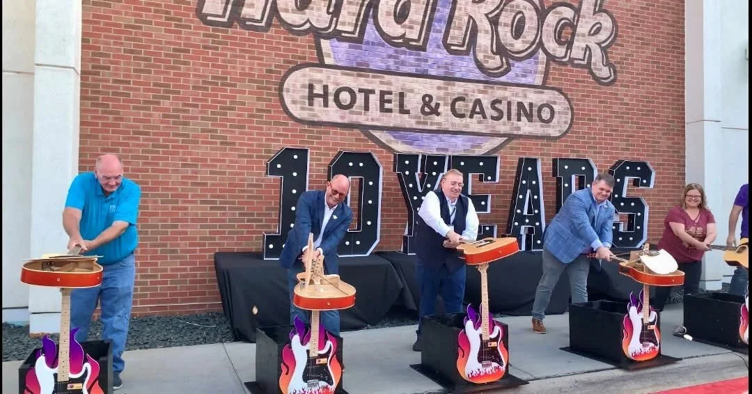 2024: Local officials, Hard Rock leadership, and representatives of Churchill Downs, Inc. commemorate the 10-year anniversary of Hard Rock Hotel & Casino – Sioux City with the iconic Hard Rock guitar smash.